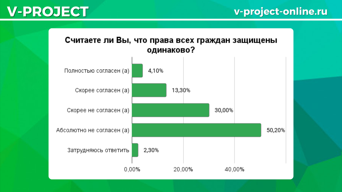 Ответ был однозначный — 80% опрошенных не согласны с этим утверждением. 17% скорее согласны, что все права граждан защищаются одинаково. Такой уровень недоверия говорит о том, что люди ощущают системное неравенство. Это может быть связано со множеством факторов. Подробнее про это ниже.