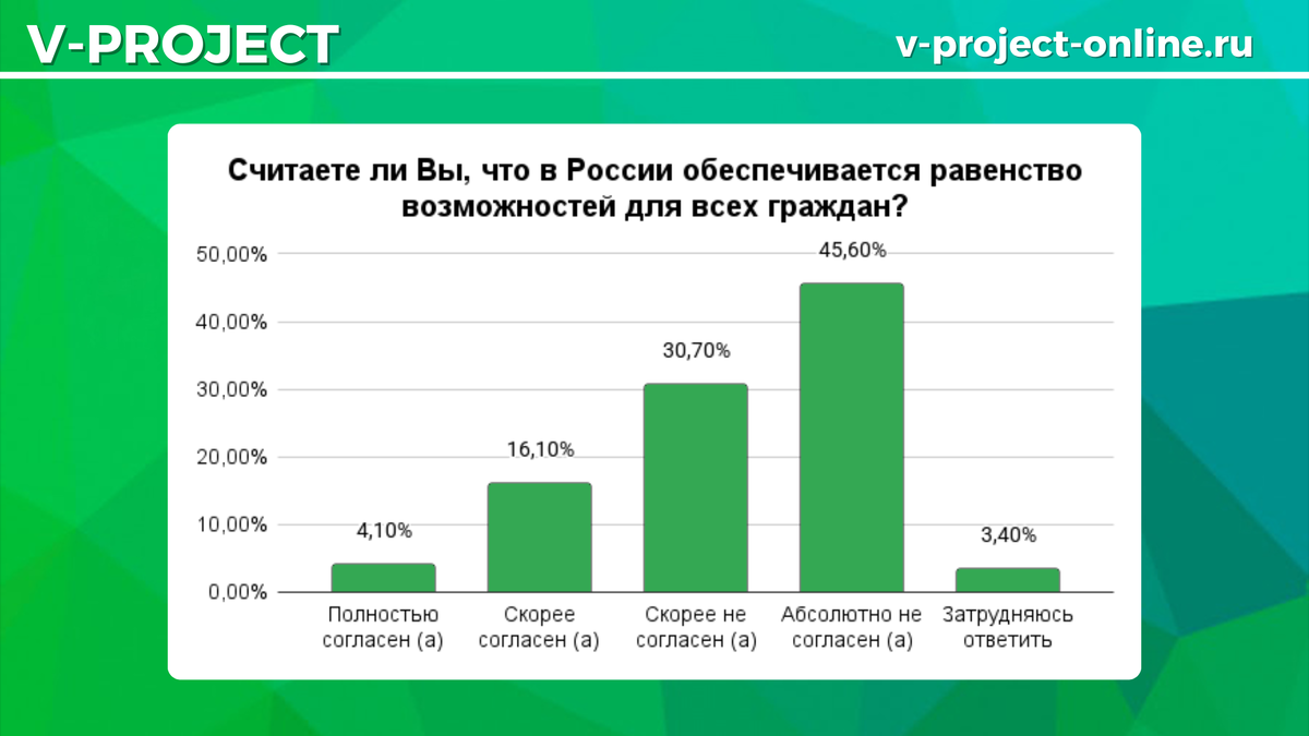 Россияне также не очень верят в то, что все граждане имеют равные возможности. Почти 76% ответили, что не видят реальных мер. Однако порядка 20% опрошенных не испытывают с этим проблем и не чувствует неравенства.