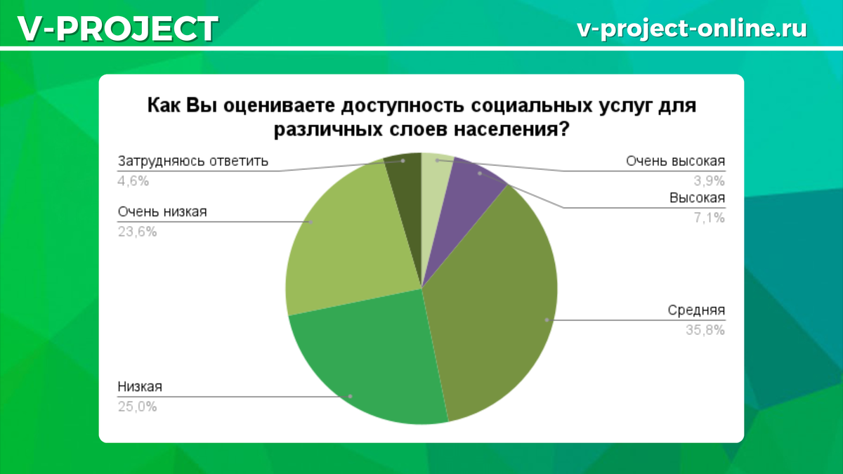 Следующий вопрос касался доступности соцуслуг — медицины, поддержки, помощи. 49% опрошенных считают, что доступ низкий или очень низкий, особенно для людей с низким доходом и в малых городах. Только 11% видят ситуацию как благополучную. При этом порядка 35% оценивает ее как среднюю.