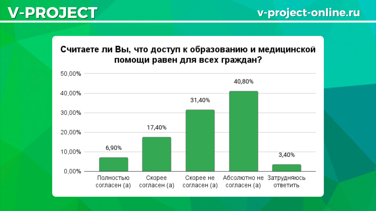 - 72% опрошенных уверены, что доступ к образованию и медицине абсолютно не равен в наше время;