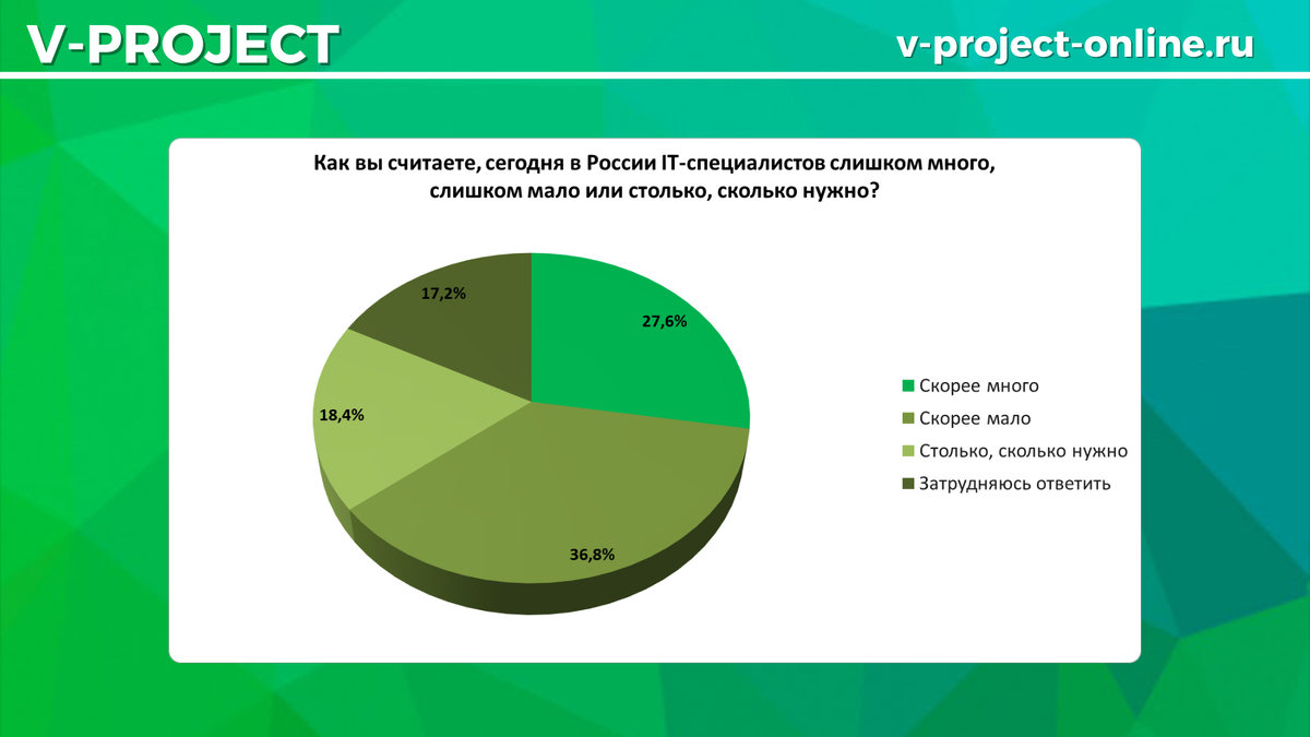 Команда V-Project узнала у россиян, как они оценивают количество специалистов в IT-сфере прямо сейчас. Так, выяснилось, что 36,8% людей выбрали вариант скорее мало, скорее много ответили 27,6% и столько, сколько нужно — 18,4%.
