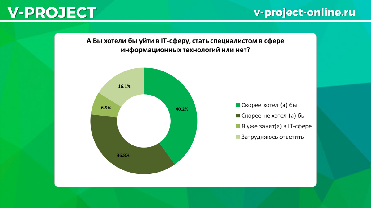 Уже в конце мы узнали у наших респондентов следующее: «А Вы хотели бы уйти в IT-сферу, стать специалистом в сфере информационных технологий или нет?». И вопрос далеко не праздный, а скорее попытка узнать, кто по-настоящему рассчитывает «перекатиться» в айти.