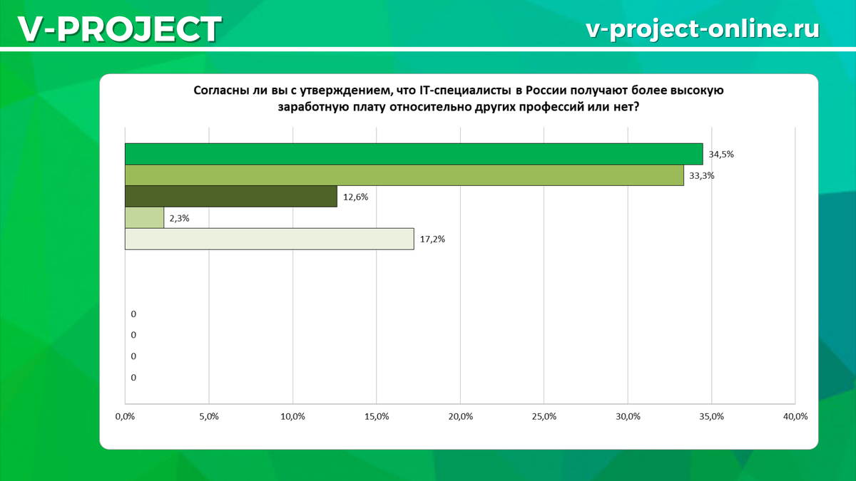 После мы задали нашим респондентам такой вопрос, как «Согласны ли вы с утверждением, что IT-специалисты в России получают более высокую заработную плату относительно других профессий или нет?». Результаты получились следующими: