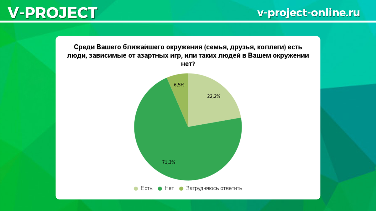 Мы также опросили респондентов о том, есть ли в их ближайшем окружении люди, которые принимают участие в азартных играх. Среди них у 22,2% есть члены семьи, друзья или коллеги, которые зависимы от азартных игр. У 71,3% – нет.