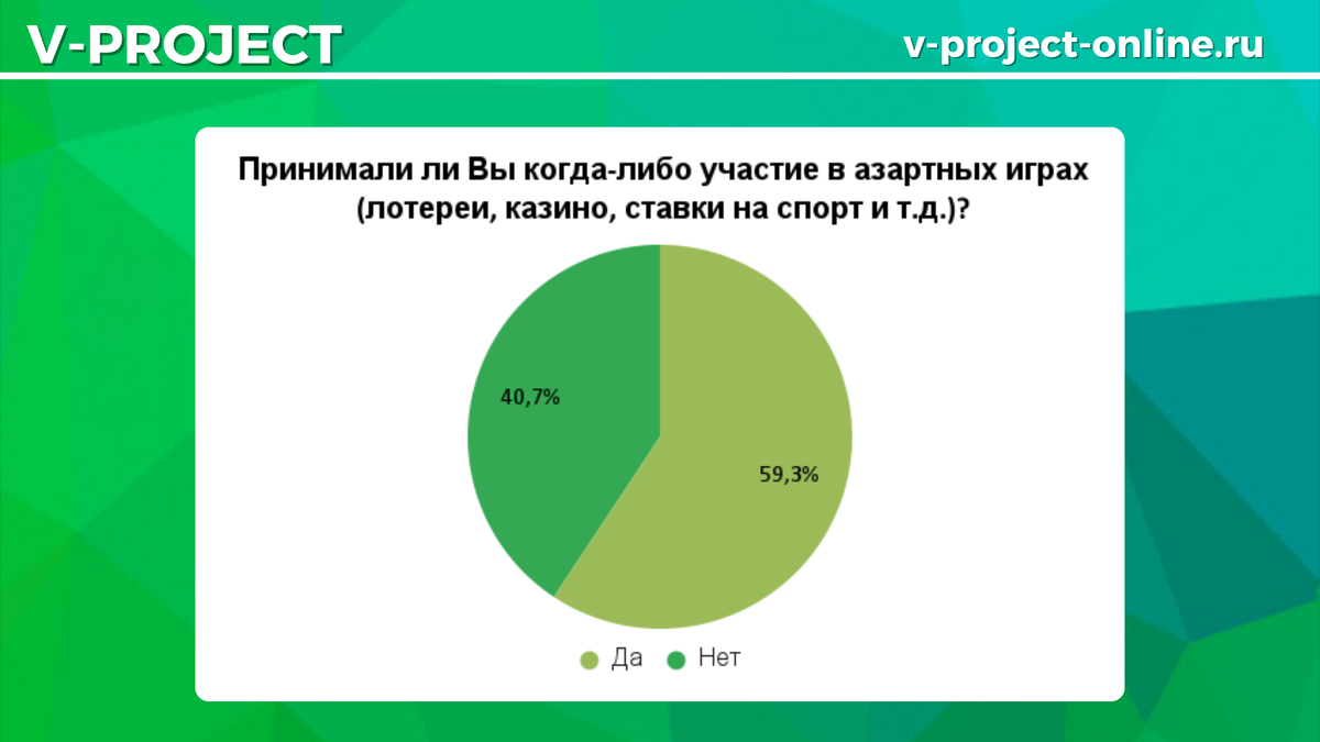 Мы также узнали, играли ли участники опроса в лотереи, казино и прочие подобные игры. Несмотря на скорее негативное восприятие азартных развлечений в глазах людей, среди опрошенных 59,3% утверждают, что принимали участие в них. 40,7% – не играли.