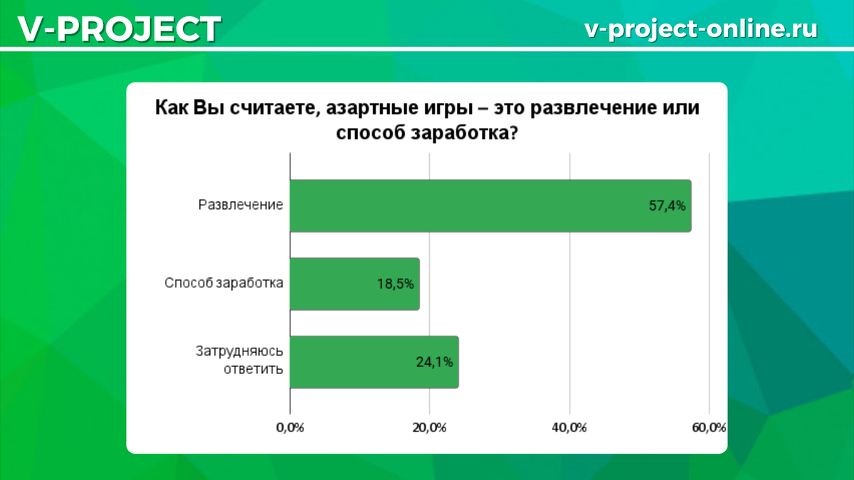 Как показал наш опрос, для 57,4% людей азартные игры – это развлечение. И лишь для 18,5% – способ заработка.