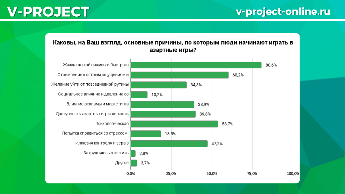 Мы выделили несколько вариантов и спросили участников, какой по их мнению приводит человека к тому, что он начинает играть в азартные игры. Результаты получились следующие: