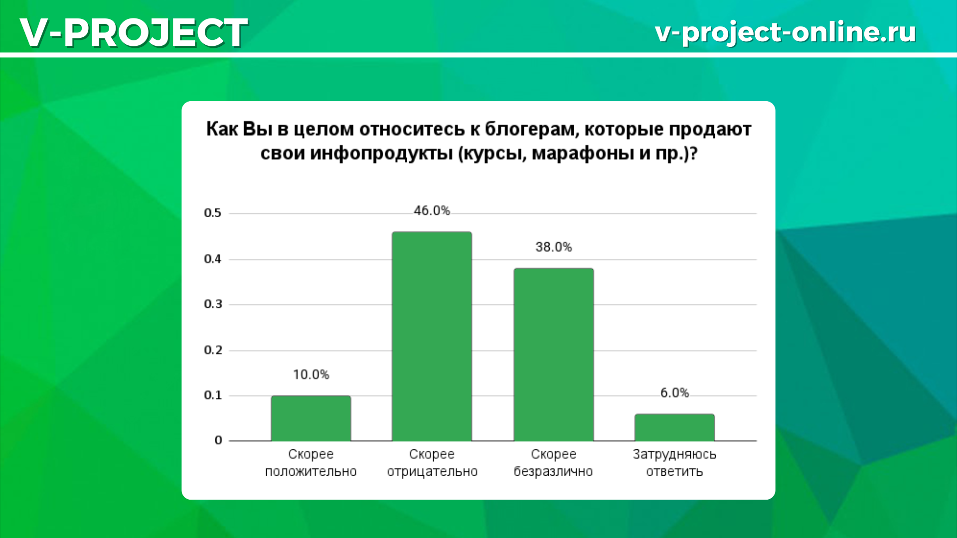 Как можно заметить, в обществе доминирует критическое отношение к блогерам, продающим свои курсы. Многочисленные нейтральные ответы (38%) показывают, что тема вызывает либо слабый интерес, либо неоднозначность мнений у значительной части аудитории.