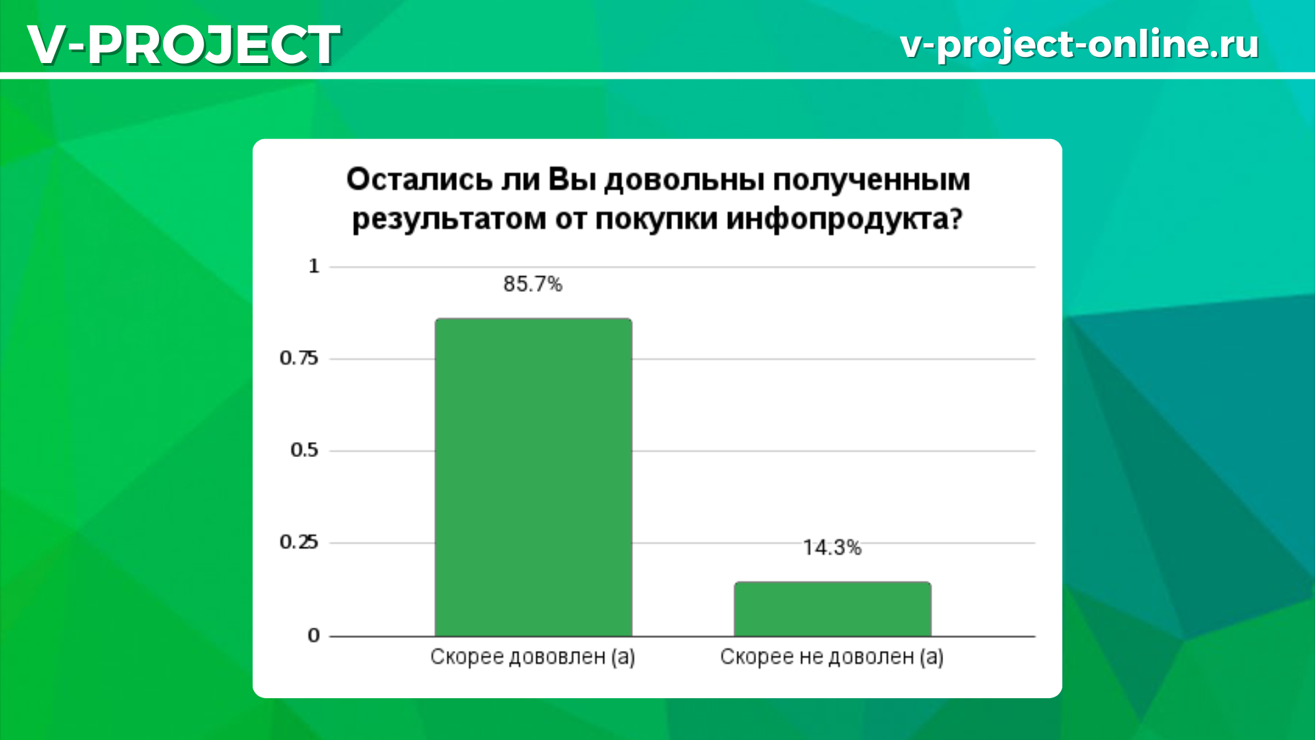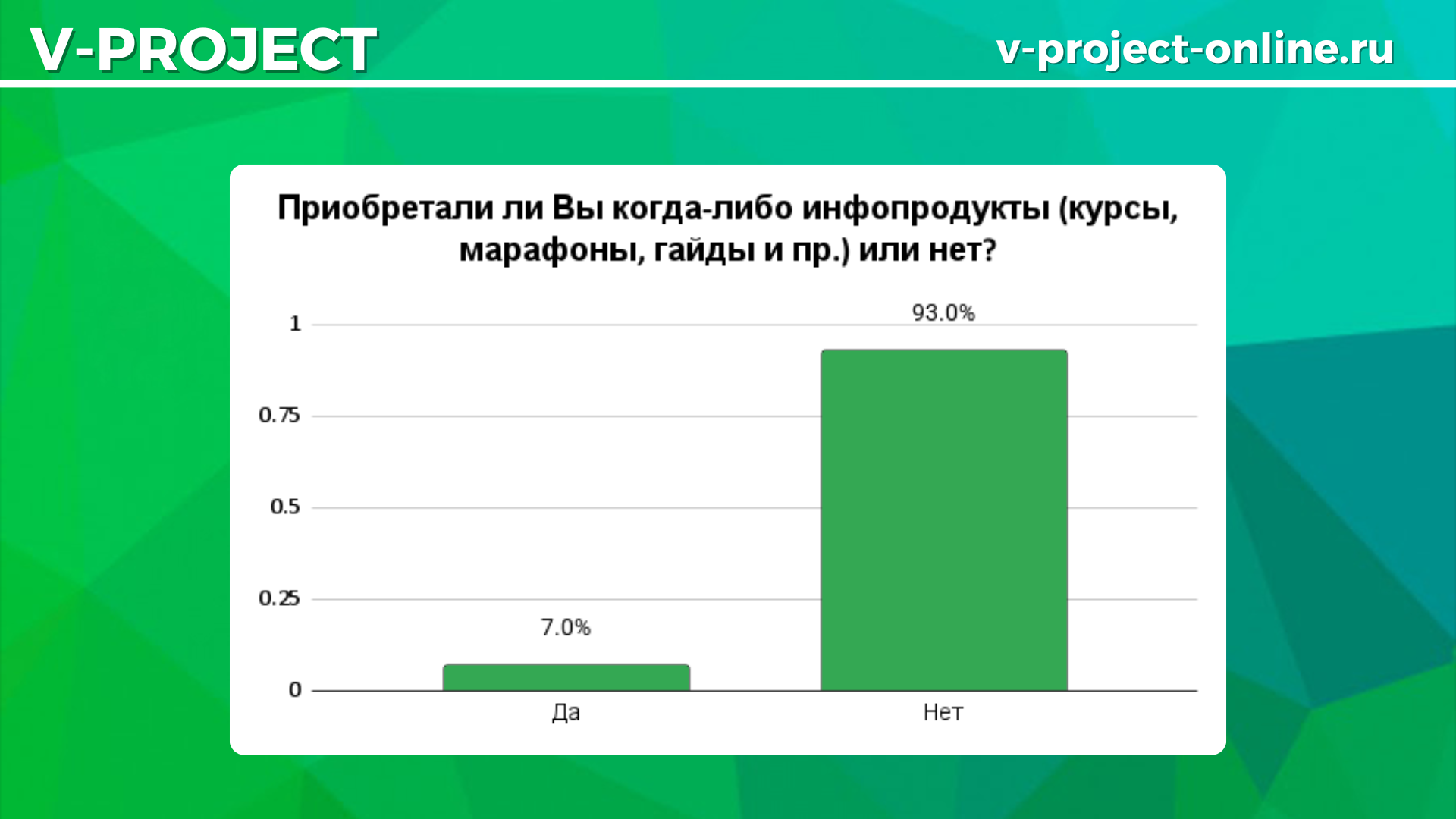 Из этого вытекает любопытная картина: проникновение рынка инфопродуктов пока невелико (покупали лишь 7% опрошенных), но среди тех, кто купил курс, подавляющее большинство (≈86%) оценивают результат скорее положительно. То есть у ранних/активных потребителей уровень удовлетворенности высокий, несмотря на общий настороженный настрой общества.