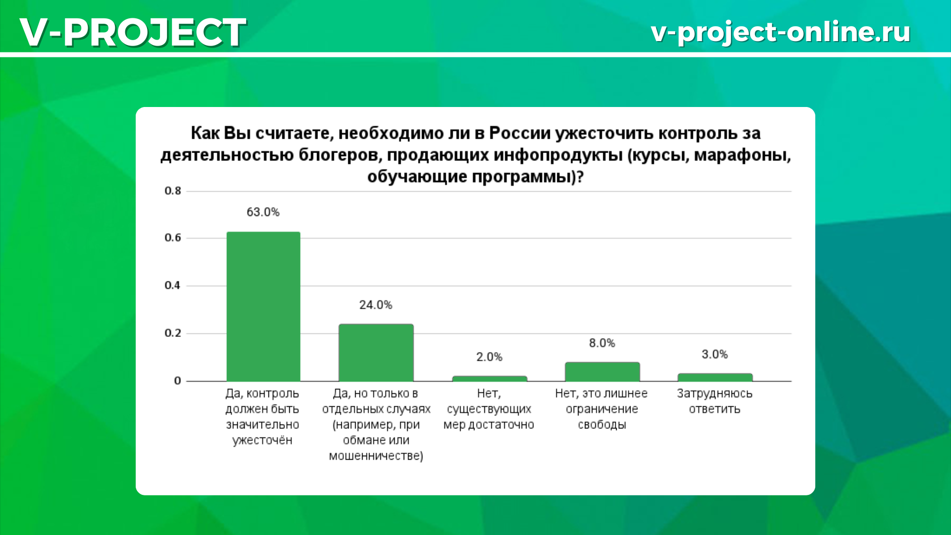 В связи с большим количеством обмана и наличием громких уголовных дел в сфере инфобизнеса появился запрос на строгий контроль за деятельностью подобных блогеров. Вот, что думают россияне по поводу необходимости ужесточить контроль за блогерами, продающими курсы: