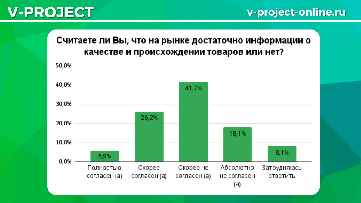 Ни для кого не секрет, что покупателям важно знать более подробную информацию о товарах, которые они хотят приобрести. Так, лишь 5,9% полностью согласны, что данных достаточно, а 26,2% скорее согласны. Однако 41,7% скорее не согласны и хотели бы больше знать о происхождении ассортимента, а 18,1% и вовсе категорически недовольны отсутствием подобной информации.