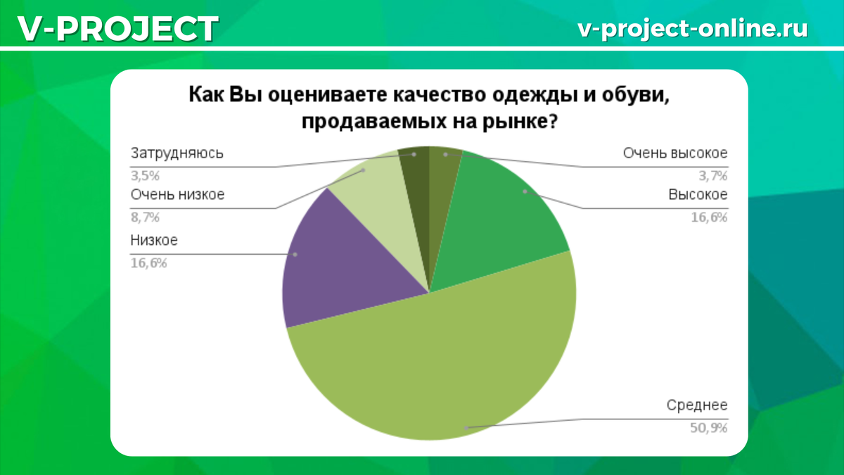 Далее нам было важно узнать, насколько опрошенные удовлетворены качеством одежды и обуви на рынке. Россияне часто оценивают его как среднее – 50,9%, высокую оценку дают лишь около 20%.