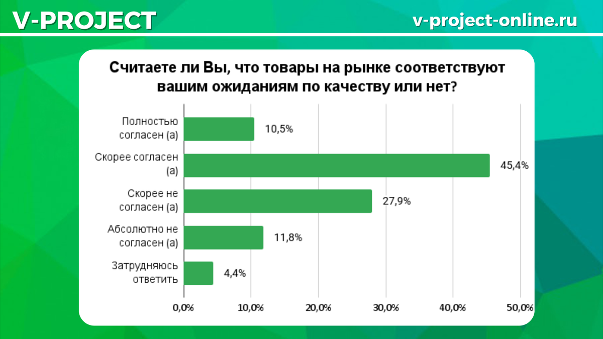 Только 10,5% полностью согласны, что товары на рынке соответствуют их ожиданиям, а 45,4% скорее согласны. При этом 27,9% скорее не согласны, а 11,8% категорически недовольны.