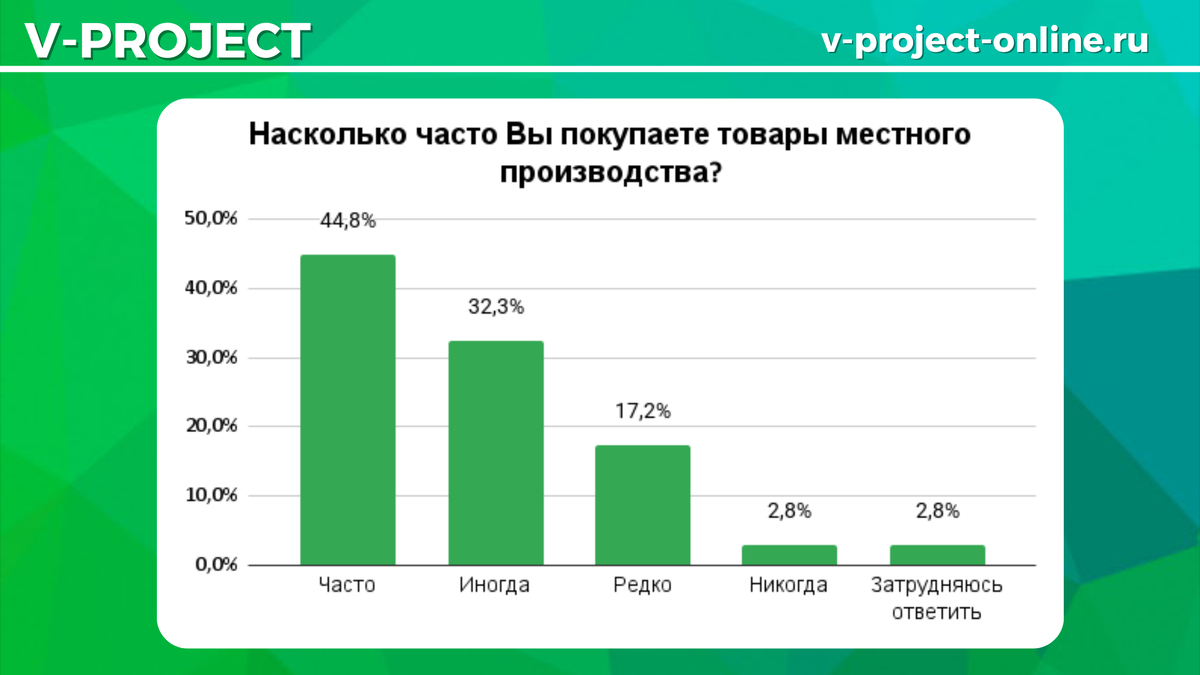 Почти 45% опрошенных часто покупают товары местного производства, 32,3% делают это иногда, а 17,2% – редко. Лишь 2,8% никогда не берут местное, и столько же затруднились ответить.