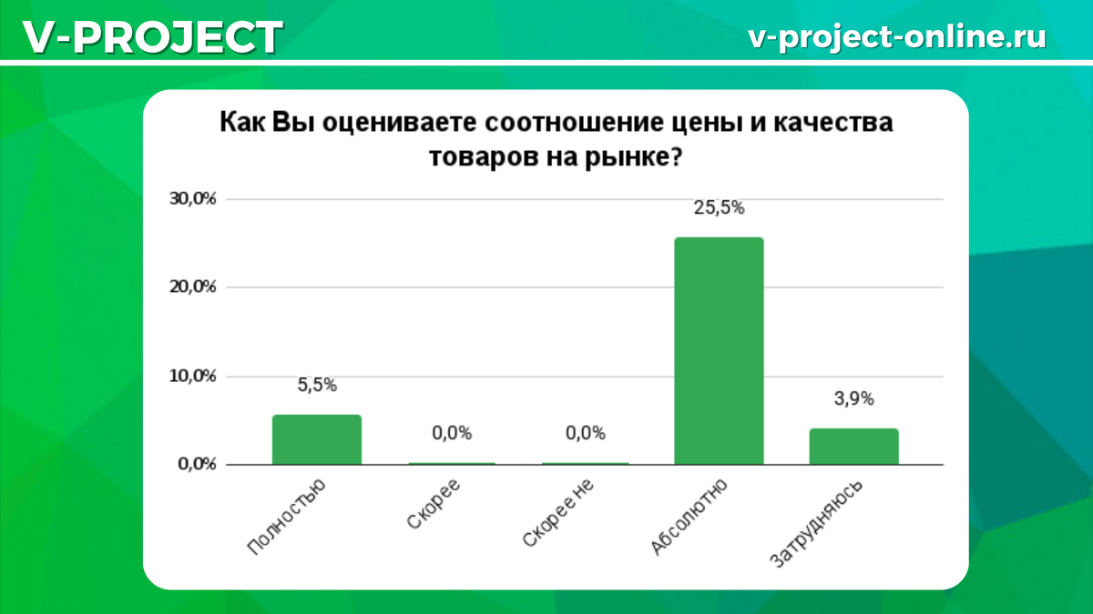 Если говорить про соотношение цены и качества, то 25,5% считают, что качество абсолютно не соответствует заявленному, и только 5,5% вполне довольны.