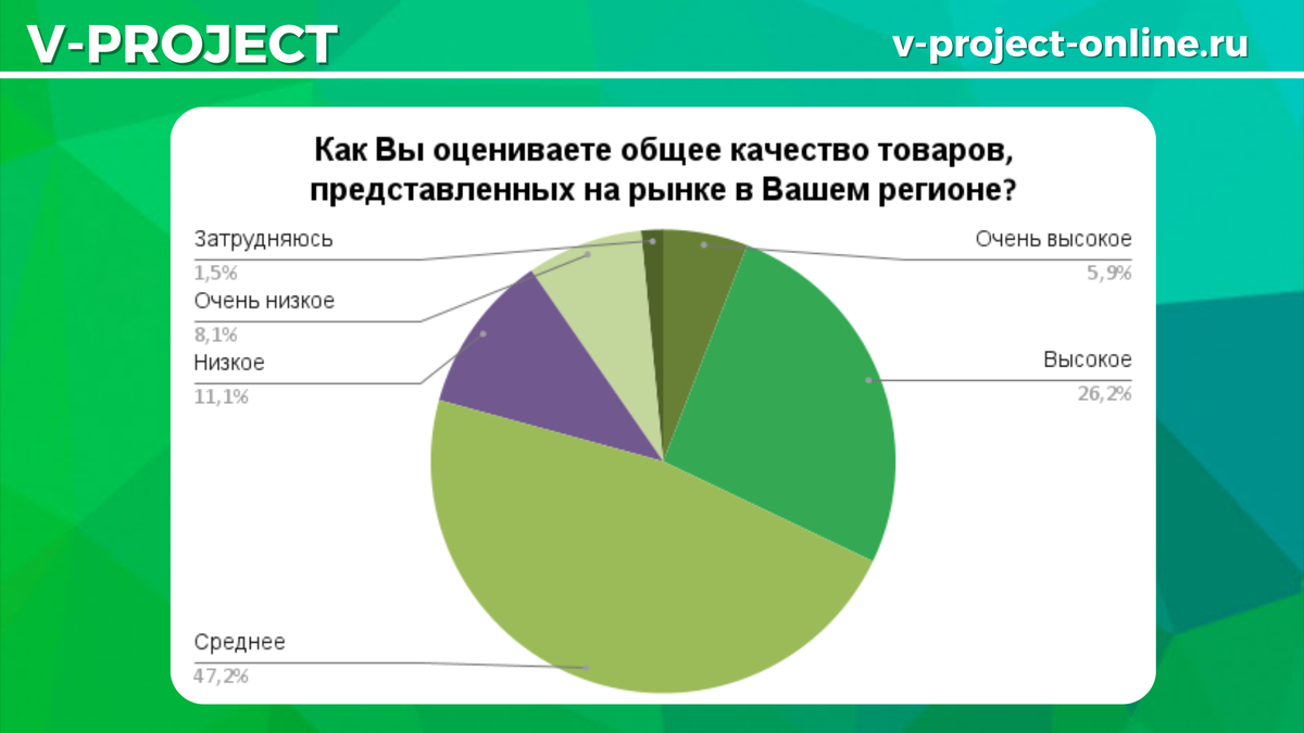 Большинство россиян (47,2%) оценивают общее качество товаров на рынке как среднее, а 26,2% – как высокое. При этом 11,1% считают его низким, а 8,1% – очень низким. Лишь 5,9% назвали качество очень высоким, а 1,5% затруднились с ответом.