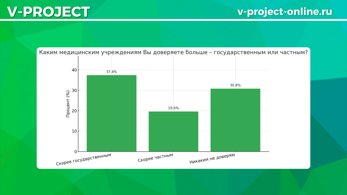 Несмотря на спорное отношение к врачам, большинство всё же предпочитает обращаться за помощью в государственную поликлинику, а не в частную. Так, 37,4% скорее доверяют государственным поликлиникам, и лишь 19,6% – скорее выбирают частные. В то же время, 30,8% не доверяют ни тем, ни другим.