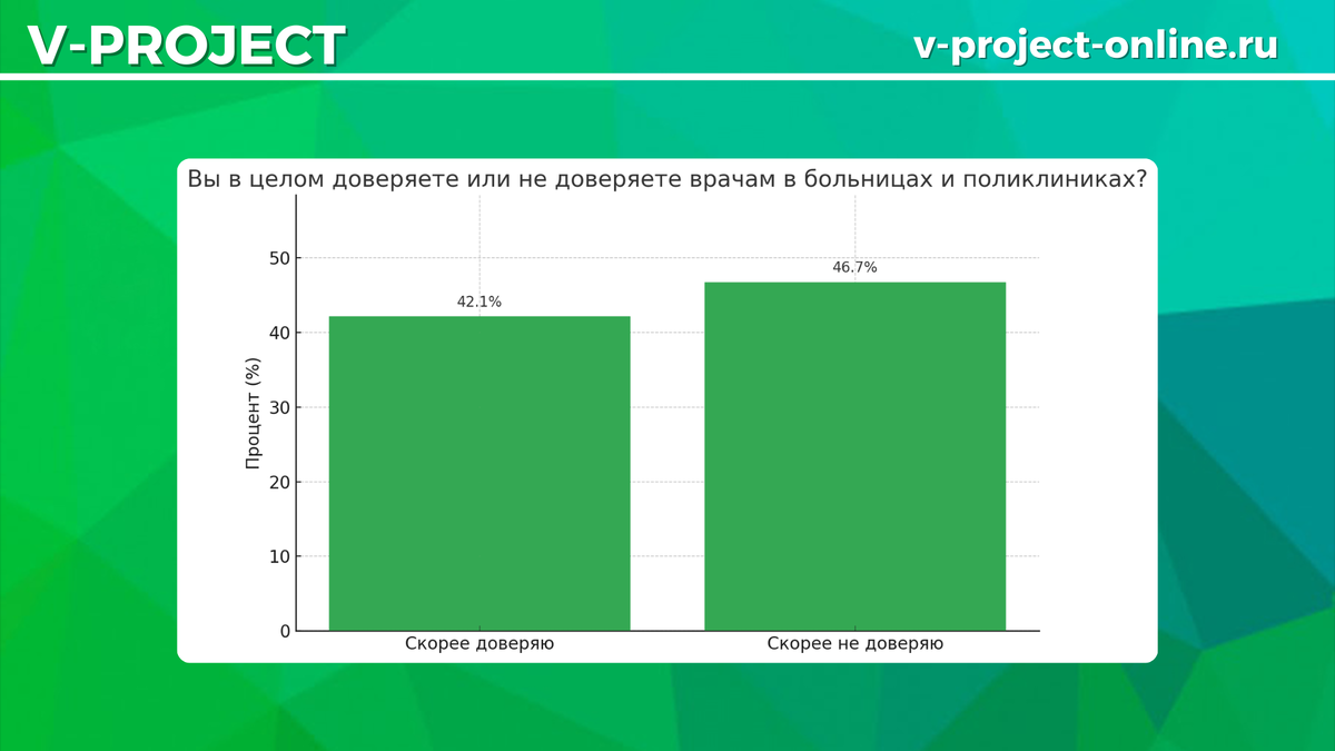 По данным исследования, далеко не все доверяют врачам в больницах и поликлиниках: 42,1% скорее доверяют врачам, а 46,7% – скорее не доверяют. Получается, что мнение разделилось на два лагеря, и всё это, скорее всего, связано с предыдущим пунктом.