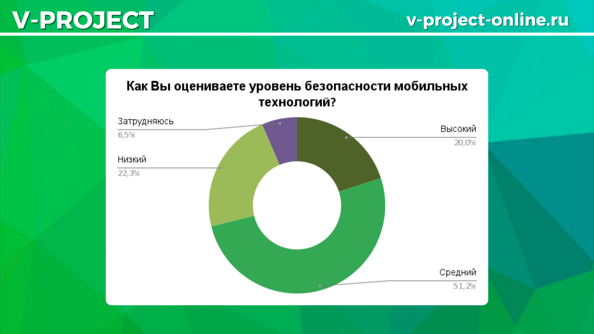Вторая часть проекта началась с такого вопроса: «Как Вы оцениваете уровень безопасности мобильных технологий?». Так, 51,2% людей выбрали вариант средне, 22,3% — низкий и высокий — 20,0%. Подобные данные могли получиться на фоне новостной повестки, где то и дело появляются новости о взломе той или иной крупной компании, действиях мошенников.