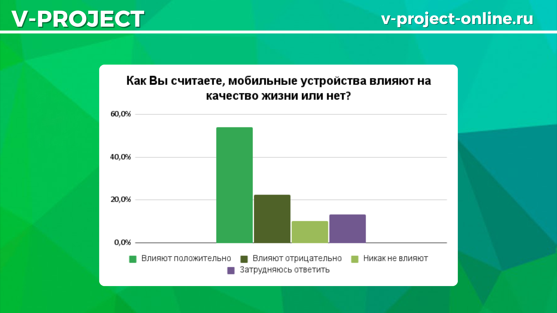 Уже в финале поинтересовались у респондентов, а, по их мнению, влияют ли мобильные устройства на качество жизни? Как можно предположить, большинство ответов распределились между вариантами влияют положительно (54%) и влияют отрицательно (22,6%).
