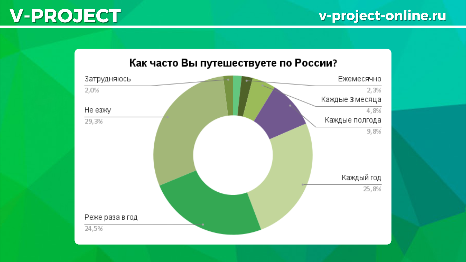 При этом было важно понять, как часто люди путешествуют по нашей стране. И большая часть мнений разделилась между тремя вариантами ответа: не езжу, который отметили 29,3% от общего количества участников опроса, каждый год (25,8%) и реже раза в год (24,5%).