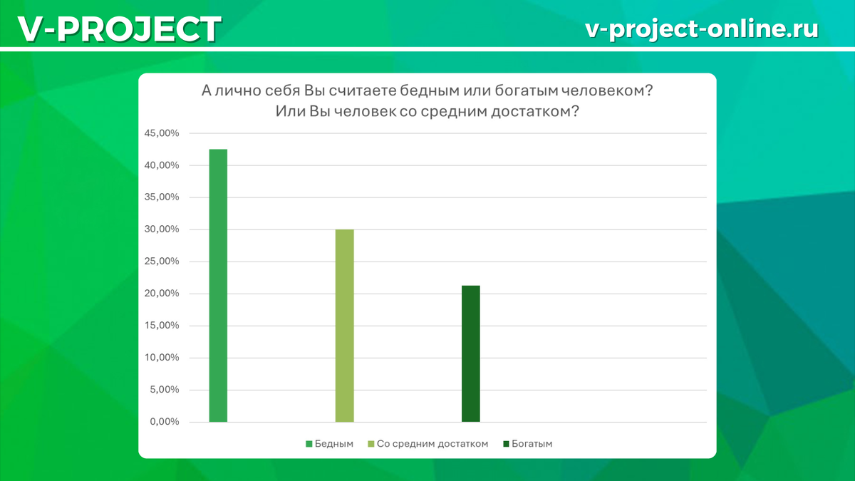Мы узнали, сколько человек в России считают себя бедными. Так, 46,3% участников опроса находятся в состоянии бедности. 43,8% имеют средний достаток и лишь 1,3% считают себя богатыми.