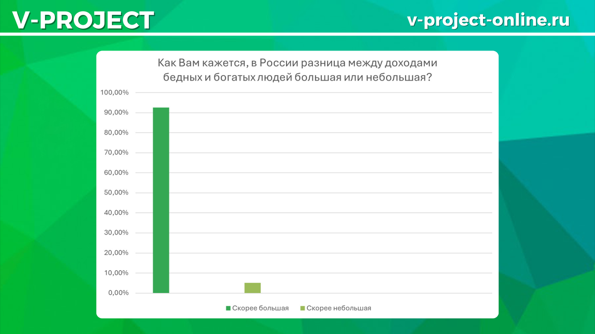 92,5% опрошенных считают, что разница между заработком бедных и богатых скорее большая. Только 5% предполагают, что разницы почти нет.