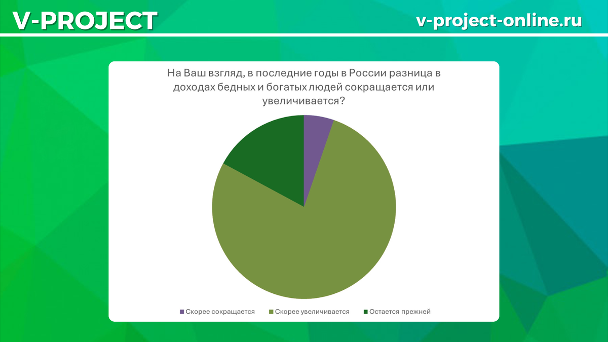 Мало кто верит, что ситуация становится лучше. Всего лишь 5% опрошенных считают, что разница в доходах сокращается. 73,8% считают, что она скорее увеличивается, и 16,3% не видят никаких изменений.