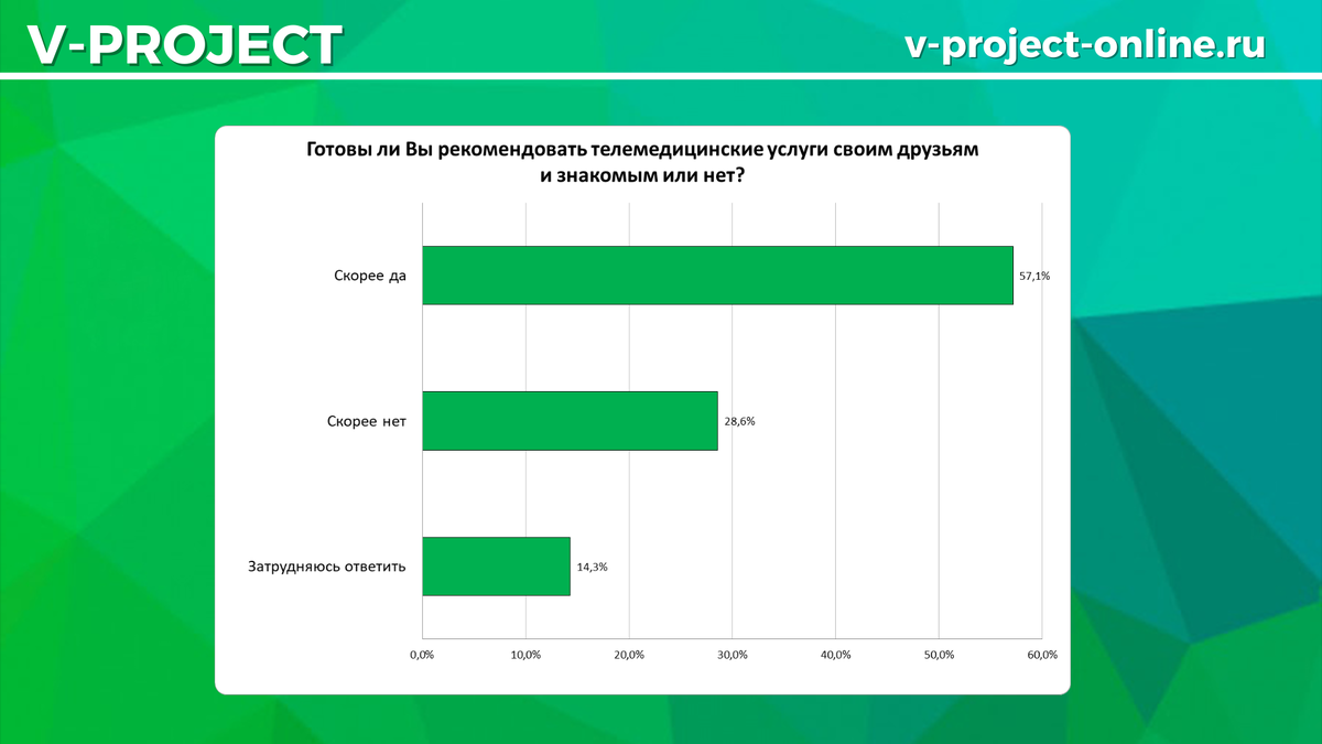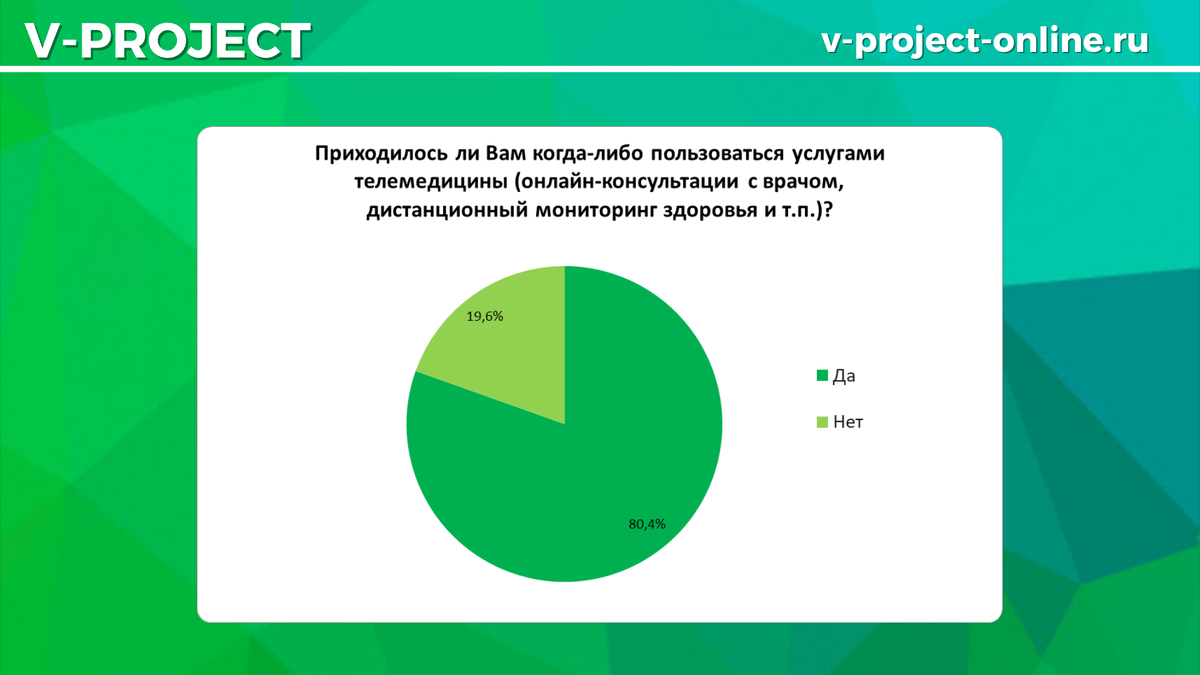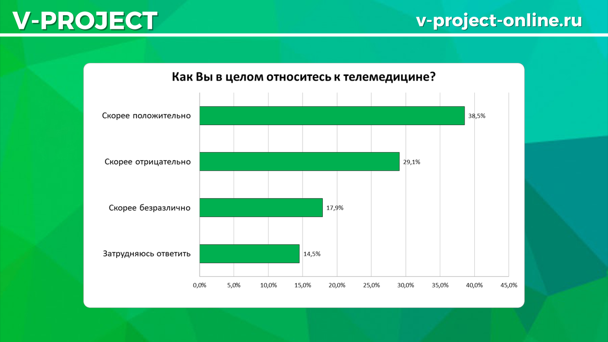 По данным исследования, команда V-Project выяснила, что россияне во многом нейтрально относятся к телемедицине, но тем не менее полностью не отрицают подобный инструмент. Возможно, в будущем интерес к этому будет только расти за счет повсеместного развития технологий.