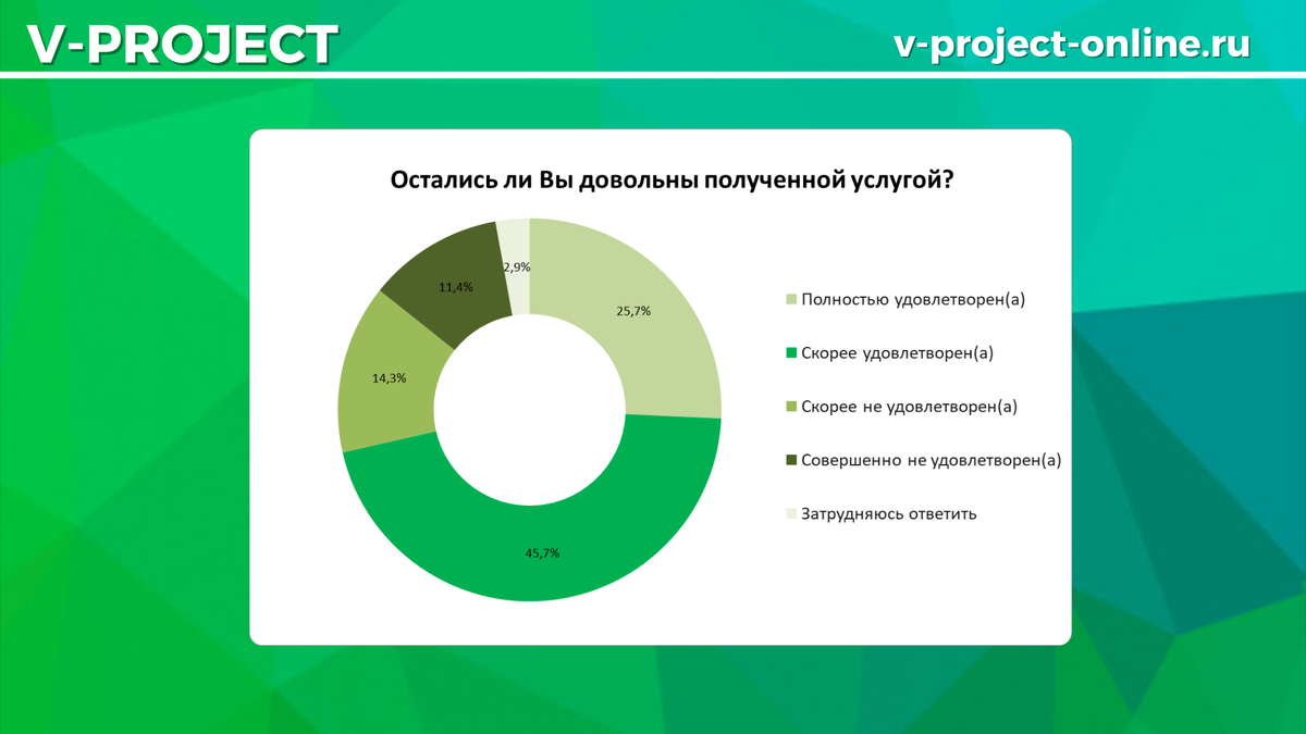 Нельзя было не узнать, а остались ли россияне довольны качеством оказанных услуг? В результате исследования удалось выяснить, что 45,7% были скорее удовлетворены, 25,7% — полностью удовлетворены и 11,4% — совершенно не удовлетворены.