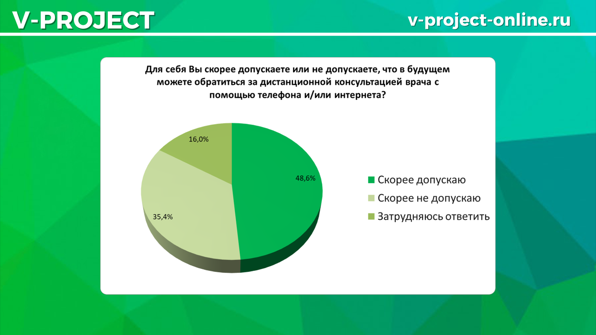 Уже в конце мы узнали следующее: допускают ли россияне, что в будущем могут обратиться к услугам телемедицины через интернет или телефон. Респонденты в количестве 48,6% ответили, что скорее допускают, 35,4% — скорее не допускают и 16% выбрали вариант затрудняюсь ответить.
