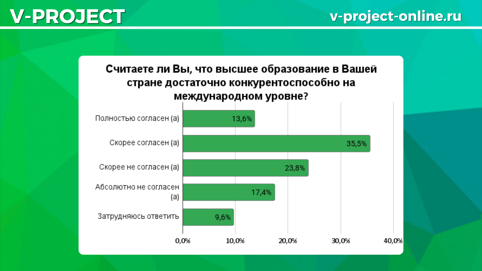 Вторую часть исследования мы начали со следующего вопроса: «Считаете ли Вы, что высшее образование в Вашей стране достаточно конкурентоспособно на международном уровне?». Среди всех прочих вариантов ответа в топ-3 популярных вошли: