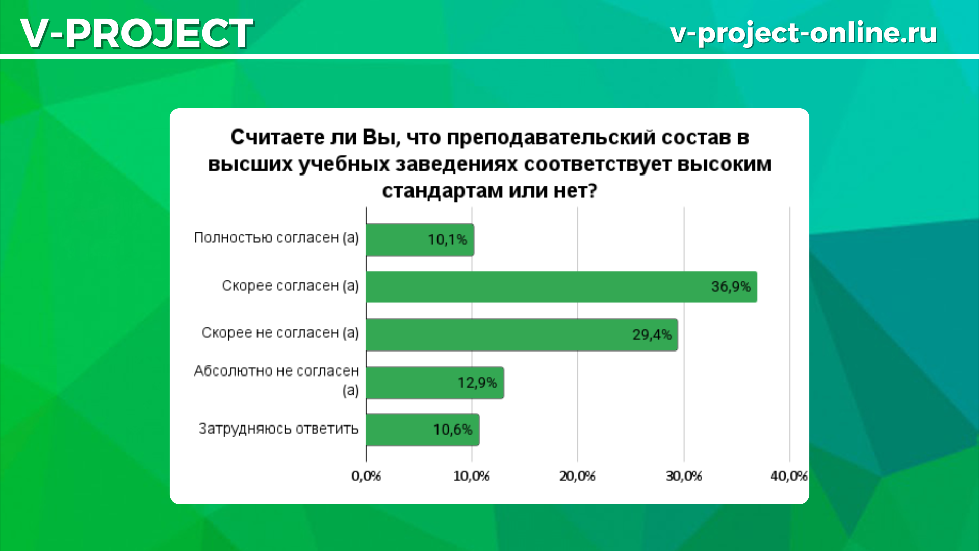 После важно было разобраться в том, как россияне оценивают уровень преподавателей в нашей системе высшего образования, а именно соответствуют ли специалисты высоким стандартам или нет? Основные мнения разделились между вариантами: скорее не согласен (а) с 36,9% ответов и скорее не согласен (а) — 29,4%. Такие ответы связаны напрямую с качеством подготовки преподавателей, их бюрократической нагрузкой и, возможно, не высокими зарплатами в сфере.