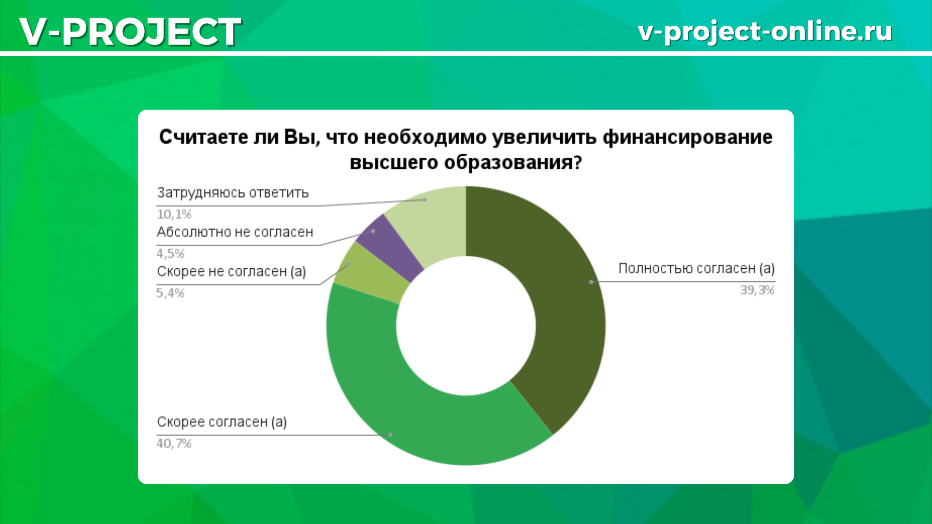 В контексте было важно узнать у людей мнение о необходимости повышения финансирования высшего образования в стране. Как можно догадаться, большая часть ответов разделилась между вариантами скорее согласен с тем, что это необходимо сделать (39,3%) и 40,7% — скорее согласны.