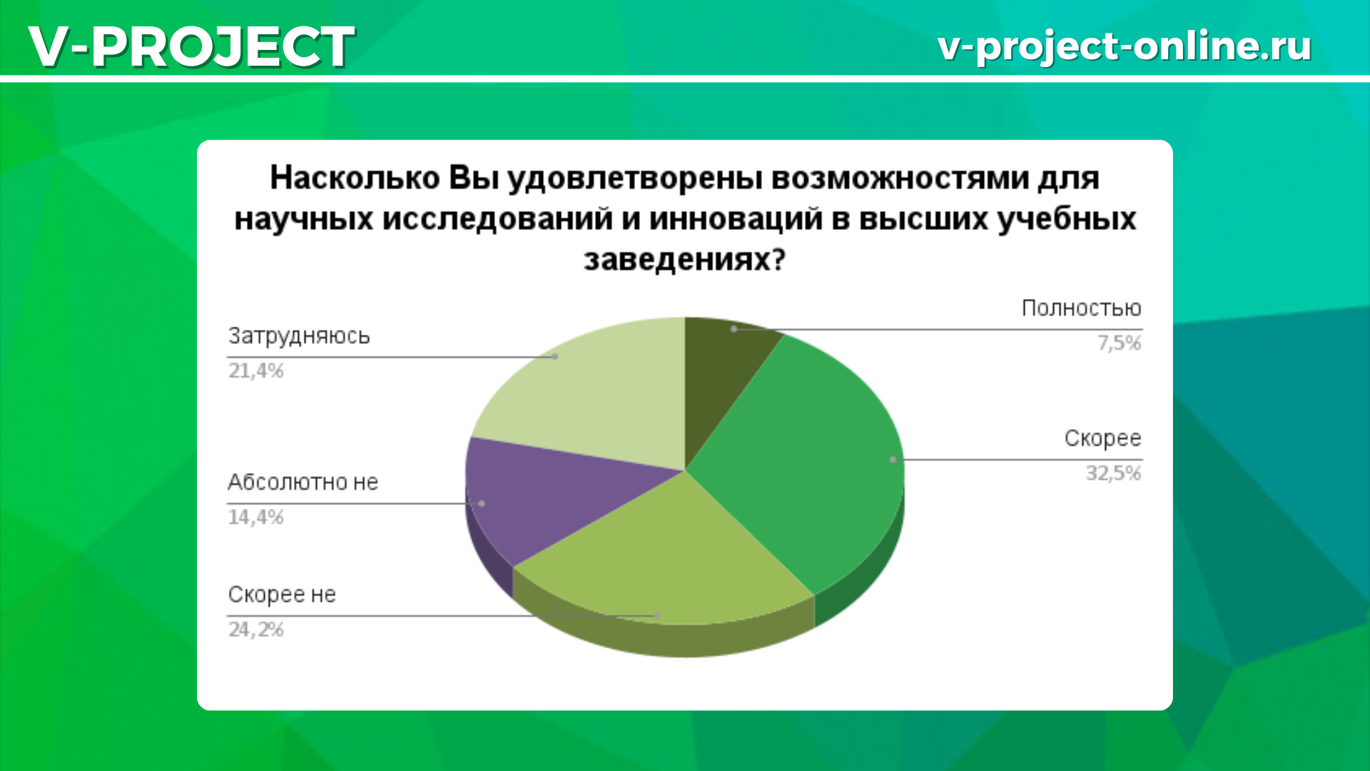 Одной из ключевых метрик развитости индустрии высшего образования является развитие системы научных исследований и возможностей для создания инноваций. Мы узнали, насколько люди довольны условиями для развития этих областей в высших учебных заведениях. 32,5% — скорее удовлетворены положением дел, 24,2% — скорее не удовлетворен (а) и лишь 7,5% полностью удовлетворены.