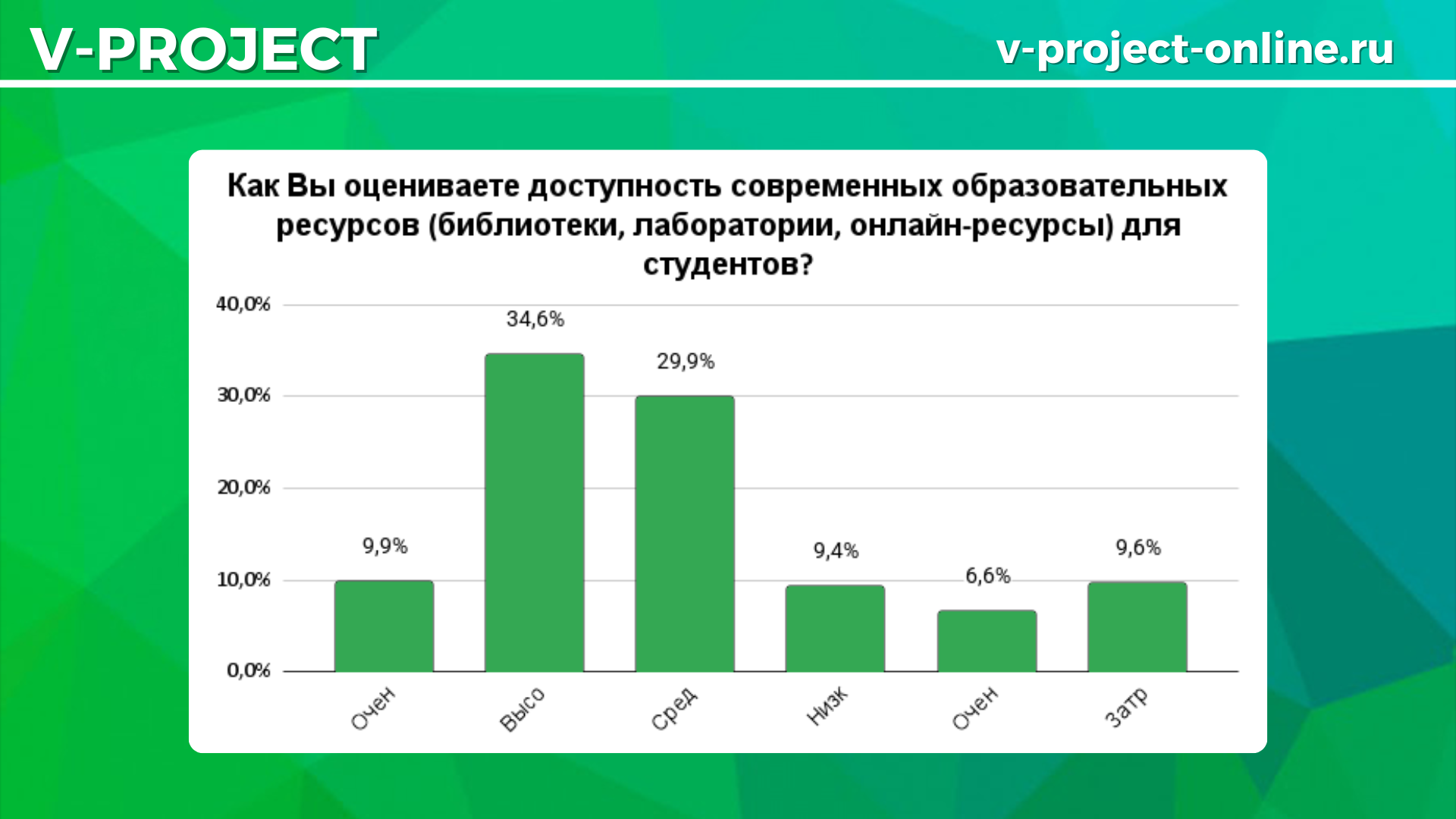 34,6% жителей Российской Федерации выбрали ответ, что доступность является высокой, 29,9% — средней и очень высокая — 9,9%. В последние годы правительство активно помогает в создании различных digital-инструментов для образования, например, чего только стоит знаменитая КиберЛенинка.