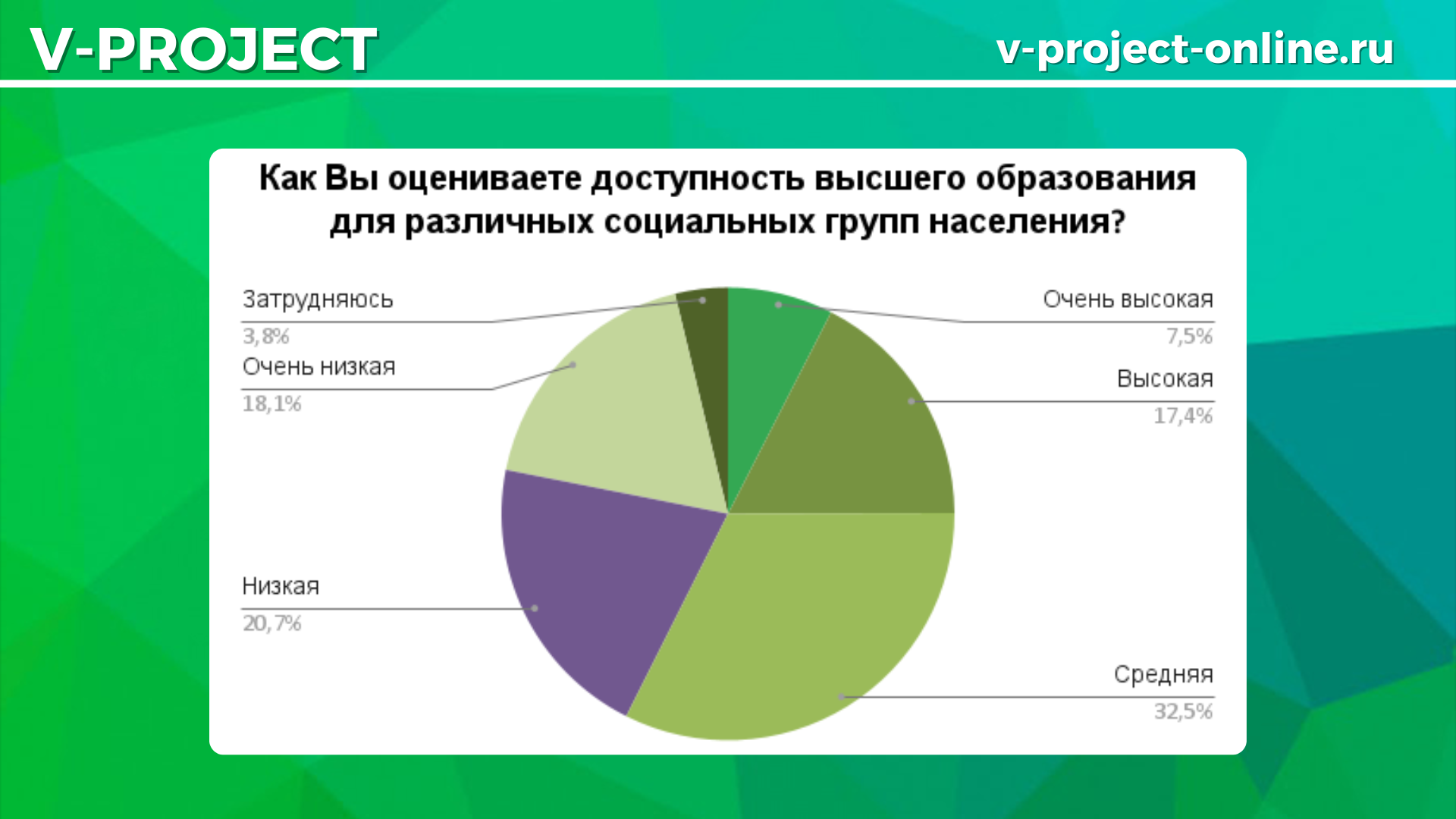 Не менее интересно было выяснить, как люди оценивают доступность высшего образования для различных социальных групп населения. Так, большая часть респондентов отметила вариант средняя 32,5%, 20,7% — низкая и 18,1% — очень низкая.