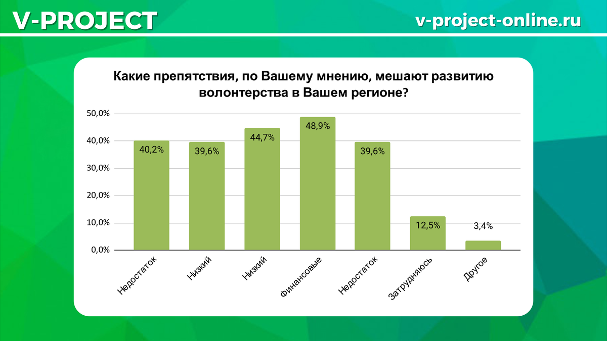 Важно было узнать, какие препятствия есть в регионе проживания респондентов для развития волонтерства. И в топ-3 заняли следующие варианты: