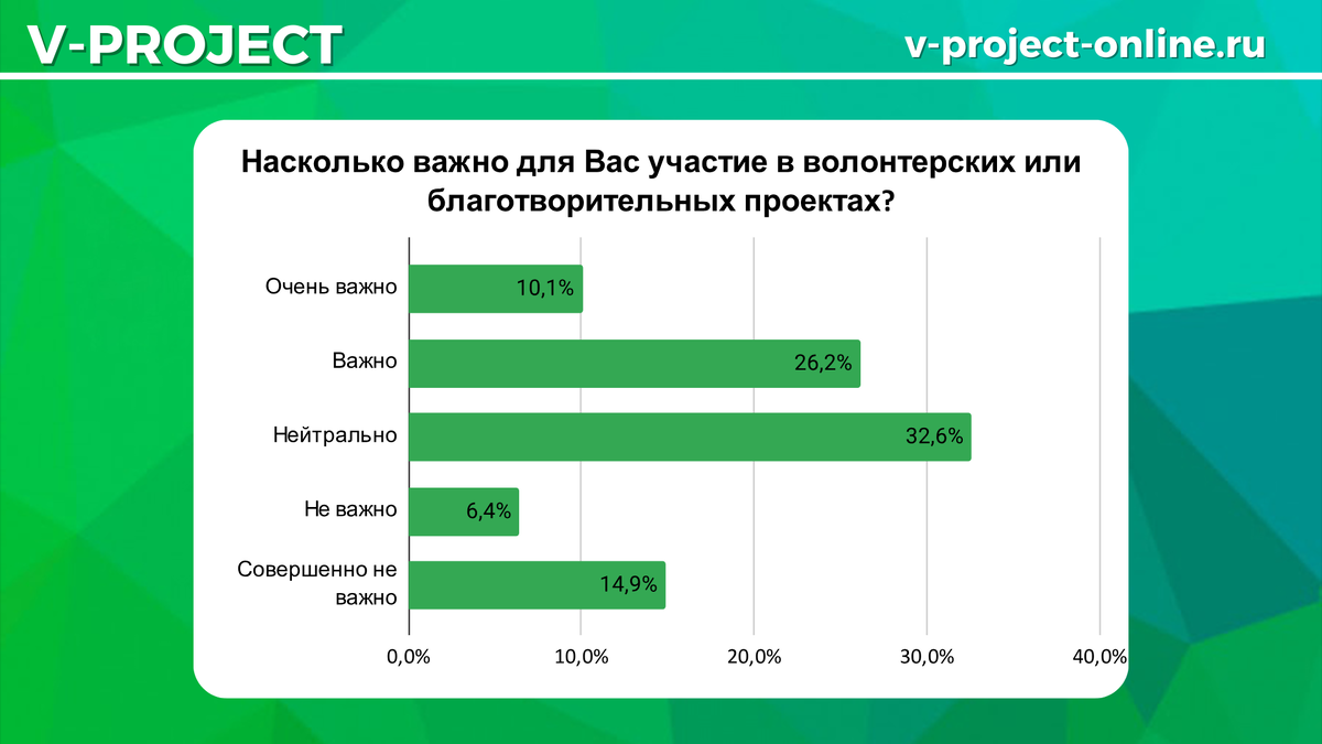 Уже после мы задали участникам исследования такой вопрос, как «Насколько важно для Вас участие в волонтерских или благотворительных проектах?». Результаты получились следующими: