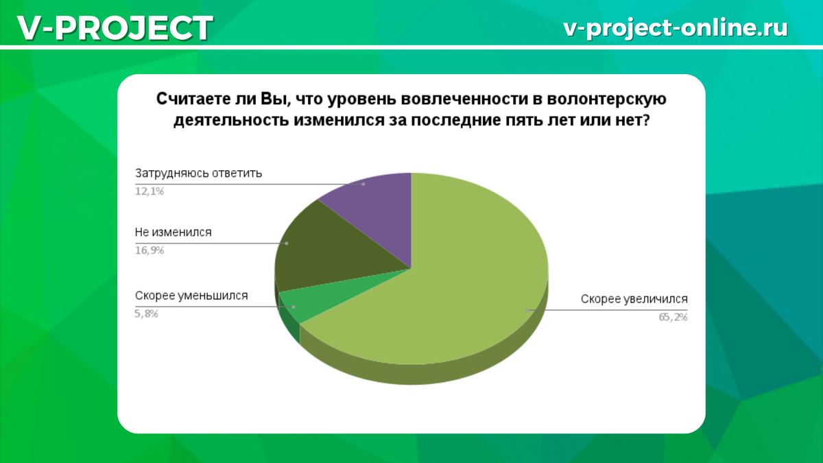 В последнее время государство активно поддерживает волонтерское движение в России. И добровольцев становится все больше, поэтому мы узнали у россиян, как они оценивают рост уровня вовлеченности людей в волонтерство. Большинство респондентов отметило ответ скорее увеличился 65,2% и 16,9% — не изменился.