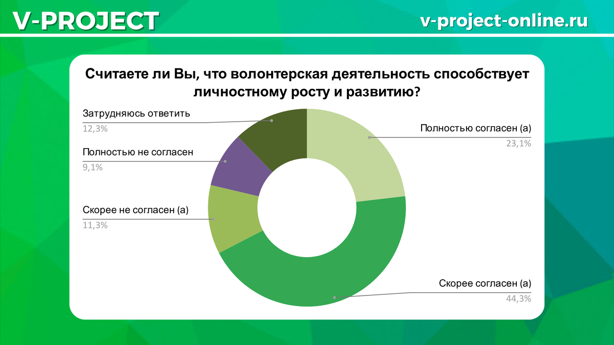В финале первого блока команда V-Project попросила россиян оценить, а способствует ли участие в волонтерской деятельности личностному росту, развитию. 44,3% ответили вариант скорее согласны с подобным утверждением, 23,1% россиян — полностью согласны и 9,1% полностью не согласны.