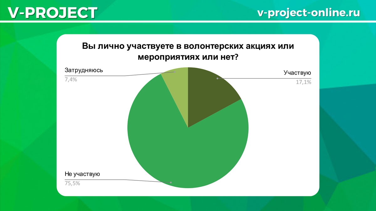 Нельзя было не спросить у респондентов о личном опыте участия в волонтерской деятельности. И так удалось выяснить, что только 17,1% принимают участие в подобных активностях, а большинство в количестве 75,5% от общего числа респондентов не занимаются добровольческой деятельностью