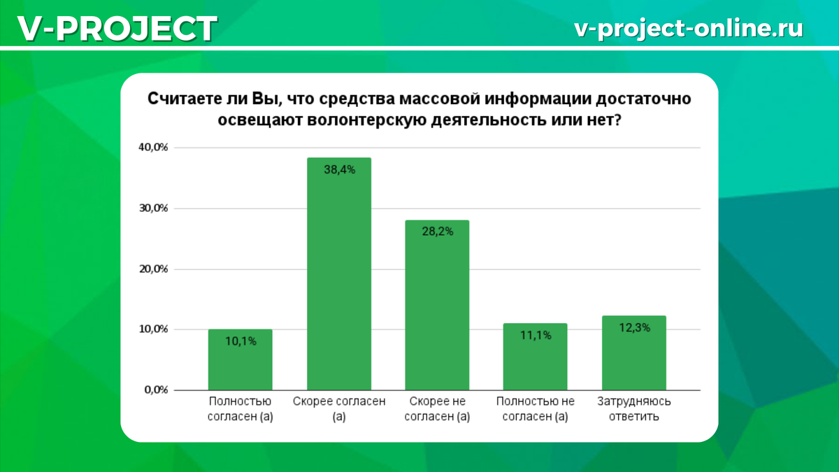 Большинство людей выбрало вариант скорее согласен – 38,4%, 28,2% отметили скорее не согласен и лишь 10,1% — полностью согласен. Обычно статьи и публикации о волонтерах носят точечный характер, а полноценного, популярного медиа о наших добровольцах попросту нет.