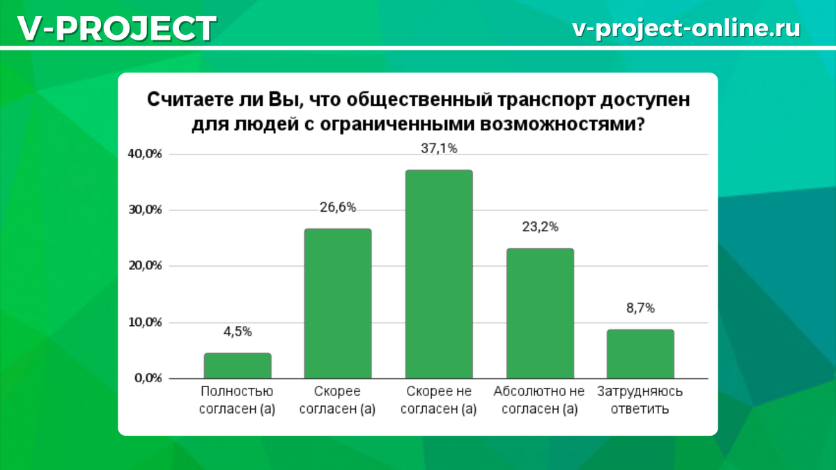 С улучшением сферы транспорта, закономерно должна была и повыситься его доступность. Мы спросили жителей согласны ли они, что общественный транспорт доступен людям с ограниченными возможностями. Вот, что они ответили: 4,5% полностью согласны, 26,6% скорее согласны, 37,1% скорее не согласны, 23,2% абсолютно не согласны.