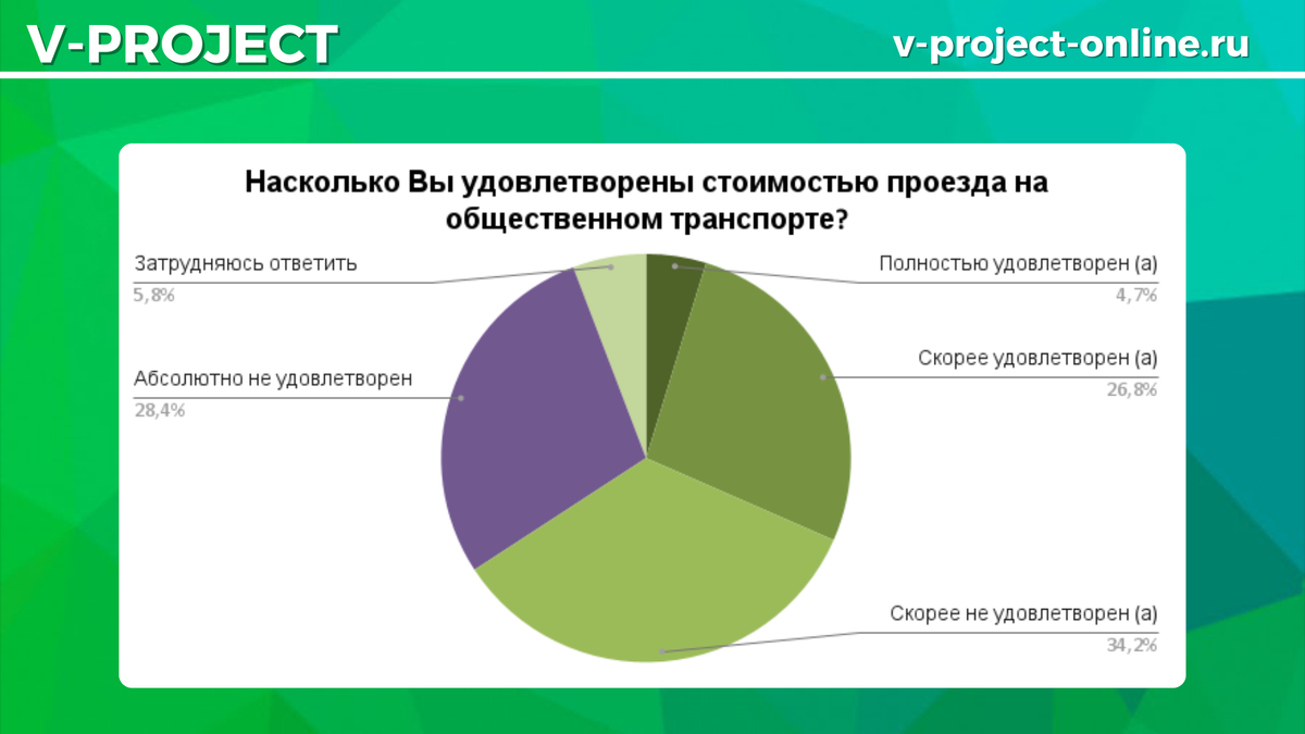 Стоимость проезда получила самый отрицательный отклик: лишь 4,7% полностью удовлетворены ценой и 26,8% скорее удовлетворены, в то время как 34,2% скорее не удовлетворены и 28,4% абсолютно не удовлетворены. При этом цена каждый год только продолжает расти, что явно не радует россиян.