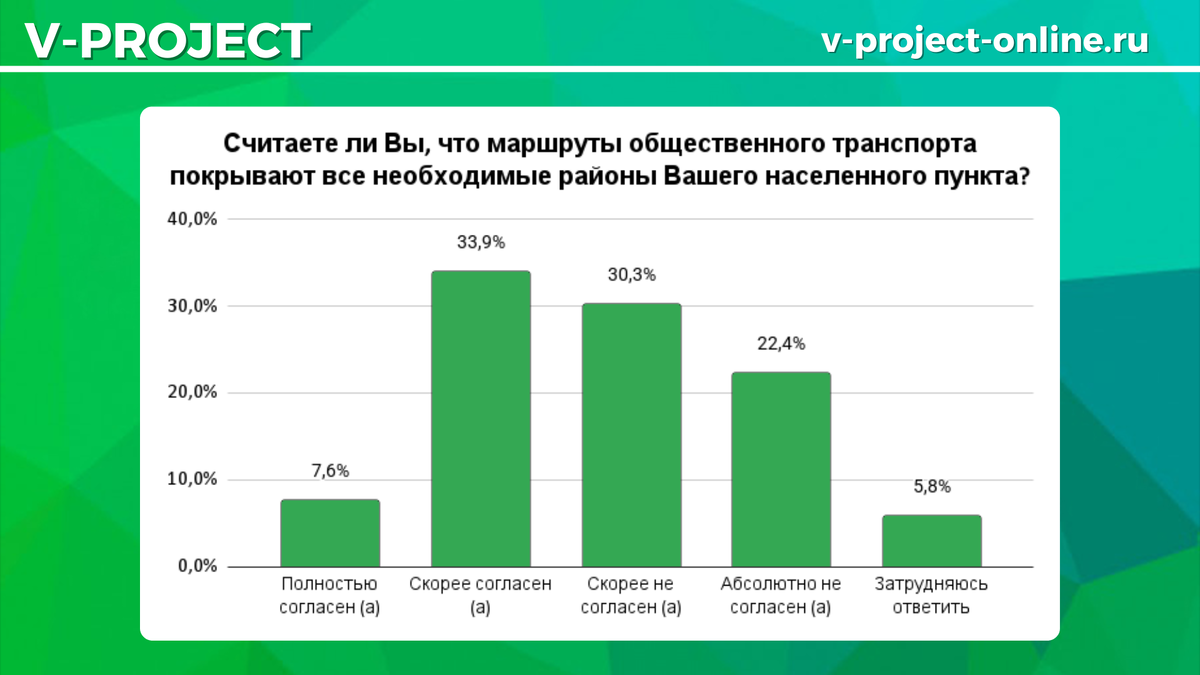 Жителям очень важно, чтобы они могли добраться от своего дома до любой точки города без каких-либо проблем. Но здесь, как и с предыдущим вопросом, всё не так гладко: всего лишь 7,6% полностью согласны с мнением, что маршруты общественного транспорта покрывают все необходимые районы их населенного пункта. 33,9% – скорее согласны, 30,3% – скорее не согласны и 22,4% абсолютно не согласны. Это говорит о необходимости увеличить количество маршрутов.