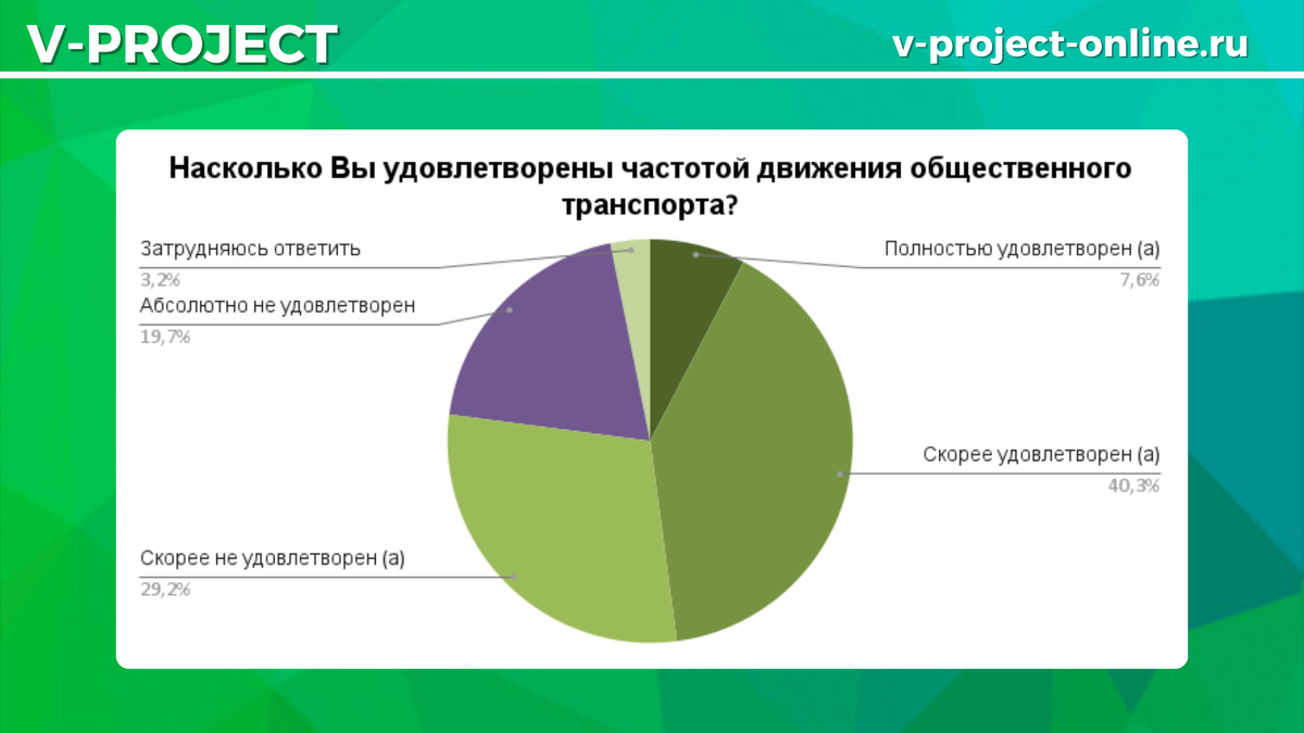 Результаты на вопрос о частоте движения транспорта получились следующими: 7,6% – полностью удовлетворены, 40,3% – скорее удовлетворены, 29,2% – скорее не удовлетворены и 19,7% – абсолютно не удовлетворены. Такие цифры могут свидетельствовать о том, что в России всё же немного не хватает транспорта для поддержания нужной скорости обслуживания.